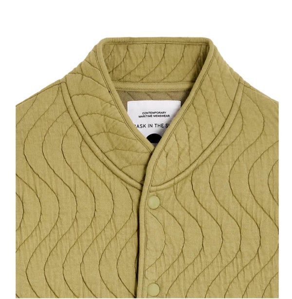 Veste en toile matelassée avec des surpiqures ondulées et des finitions en bais de coton. Deux poches discrètes. Fermeture par boutons à pression.