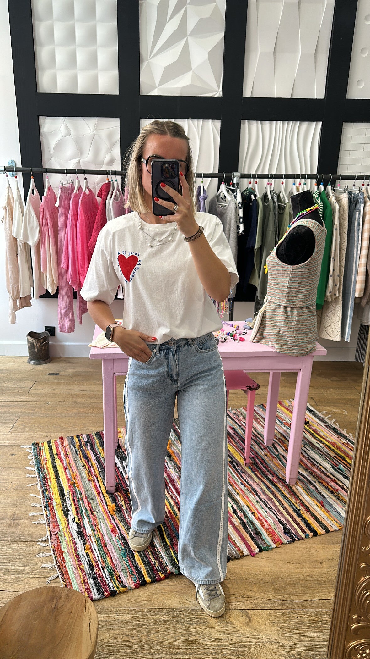 Pantalon en jean en denim clair classique, avec double bande latérale brodée en forme de cœur, style large.