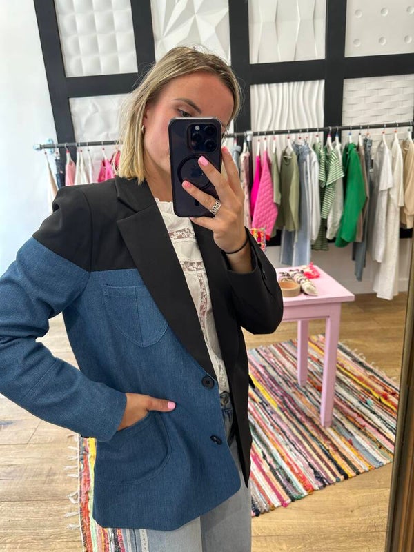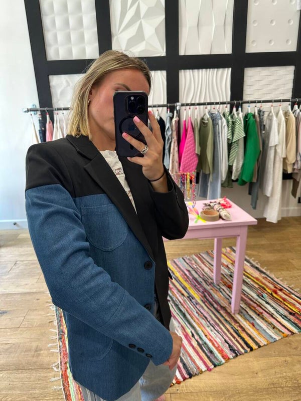 Un côté veste de blazer classique et l'autre veste en jean